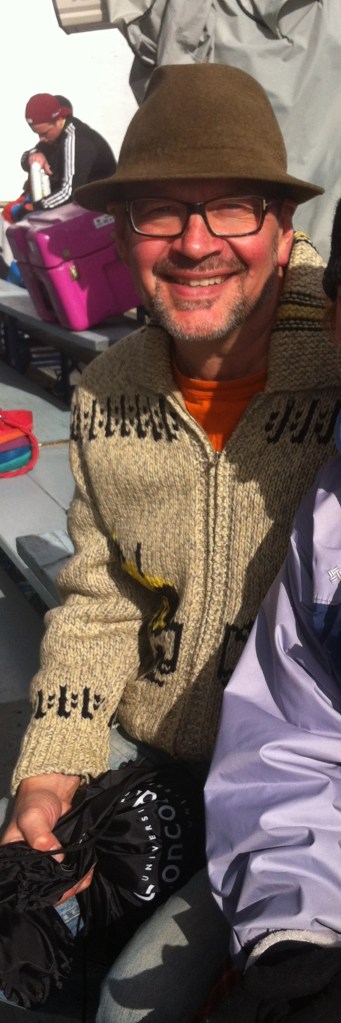 This last week I put the sweater on. My father has been wheelchair-bound for a long time. He’s lost weight – a lot of weight, and the sweater that I had made smaller would now be much too big for him in turn. I wear it, not in Saskatchewan where it came from, but in Montreal, where, for at least the moment, and for certain groups of students such sweaters are all the rage (not being the pinnacle of style, I may have missed ‘the moment’ even as I report it!).