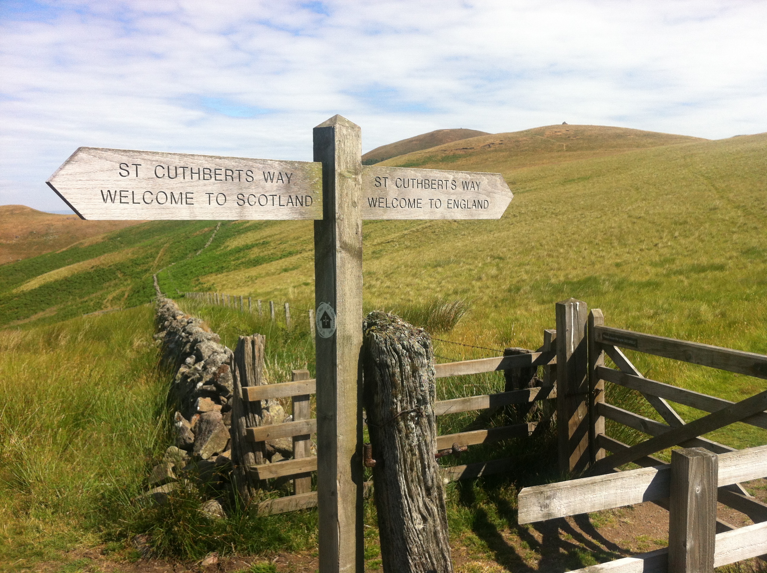 Perhaps my favourite gate is the one on St. Cuthbert’s Way, at the dry-stone fence, edged by thistle and grass, that marks the border between England and Scotland. It was a bit lonely a location, on the top of a knoll and across a valley from a Bronze Age ring fort, but the day I reached it I felt a sense of occasion crossing, and missed having someone there to share it with. There should have been a pub, as there had been, and a good one, back in Kirk Yetholm. Instead there were cattle, and stinging nettle, and burnt-yellow grass, so I kept on.