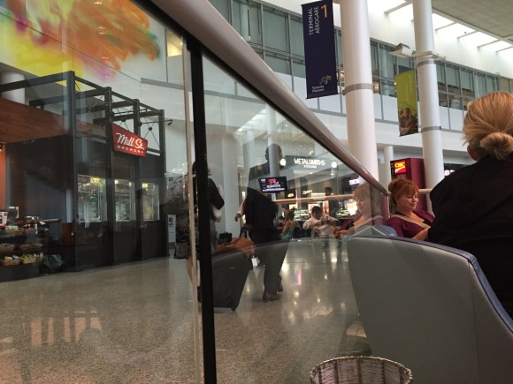 airports have sometimes been called ‘non-places’, empty of local flavor and culture, distressingly similar, spots that only exist to be on the way somewhere else. It’s true that reality here seems far from the wind and grass. I miss the feel of grass working its way into my socks, the smell of sage. From where I sit I can count eleven screens, without turning my head.