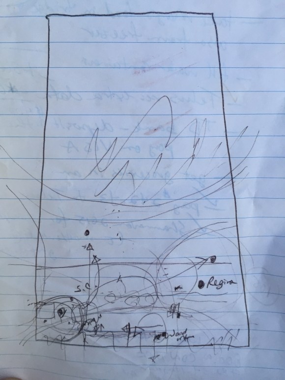 But that ‘not interesting, only good for passing through’ description has also been leveled at the prairies. And the truth is, all spaces can become places if we pay attention and know their story. Here is a drawing I made the first day I arrived, of our route (and my roots). Imagination is also a transitional place. We imagined this long walk, and it came to be. Space became place, in the walking and the telling. Still, I miss the prairie.