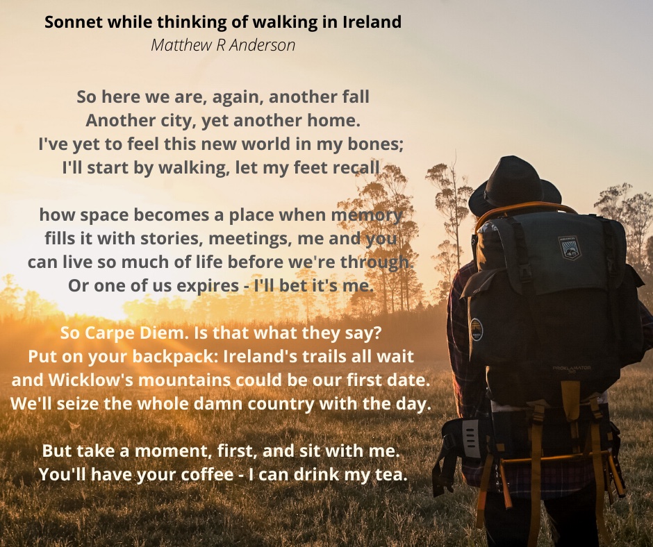 Categories Uncategorized Sonnet While Thinking of Walking in Ireland Post author By somethinggrand Post date September 20, 2021 7 Comments on Sonnet While Thinking of Walking in Ireland Sara set me the task of writing a sonnet for my daily writing exercise. Here’s what popped out: