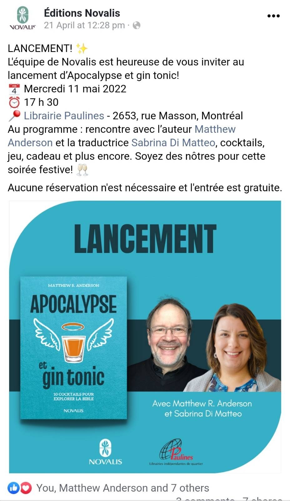 I’m delighted with the wonderful translation into French of Pairings: The Bible and Booze, done by biblical scholar, podcaster, journalist, Catholic activist, and PhD student Sabrina di Matteo (phew, it’s tiring just to list all those occupations!). So it’s a real pleasure to announce the upcoming French-language book launch where we present this book to the world together!