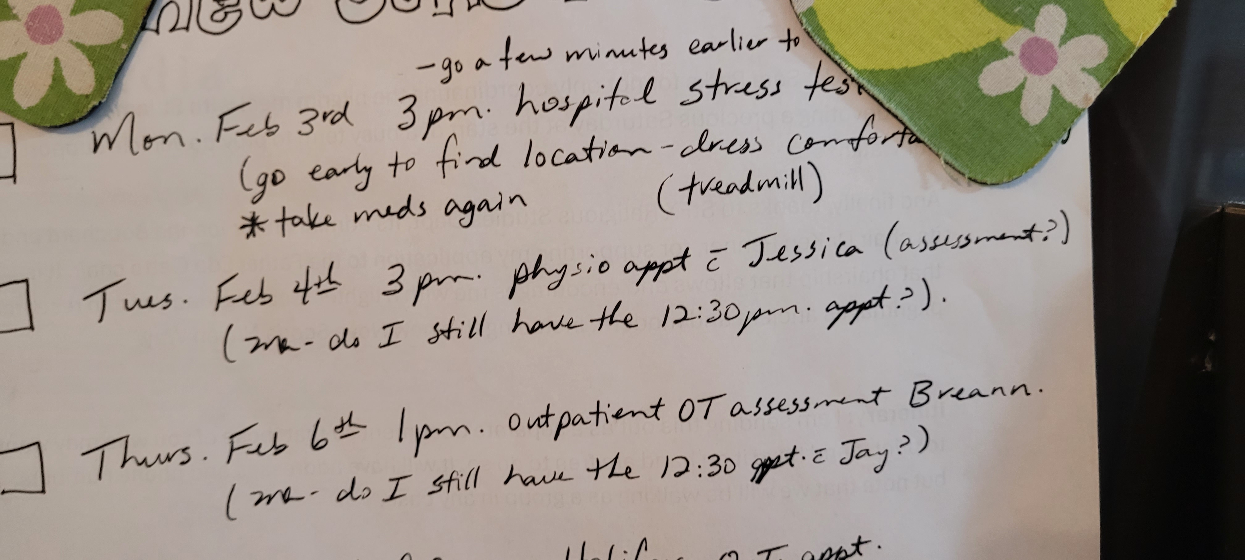 Since Sara and I live in the country, not having a driver’s license would have meant a major life change. These days I’m teaching two days a week at Saint Francis Xavier University, 17 km down the highway. (Last week’s midterm exam for Bible and Film pictured above!) A normal week also means driving in two mornings for the Nova Scotia Cardio rehab program “Hearts in Motion” at the StFX Amelia Saputo Centre gym, where I and a dozen other heart patients get sessions on exercise and diet and 75 minutes on the treadmills, stationary bikes, and (for me) elliptical machines. I usually bump into one or two of my students, which is nice. Twice a week I also head back to the stroke rehab centre at the hospital, now as an outpatient. There I do 30 minutes of physio and 45 minutes of occupational therapy. Then there are all the appointments for blood tests, stress tests, reassessments, and consults, most here, but some coming up in Halifax.