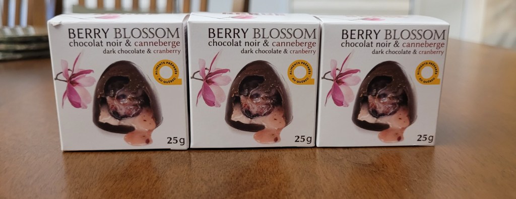 Like everyone else, I’m having a hard time not doom-scrolling and feeling anxious these days because of the news. But my stroke recovery books – and my common sense – tell me that what’s best for my condition is to maintain a hopeful and constructive attitude, and allow my self-discipline and anxiety to be tempered by humour and forgiveness (good advice for us all). So I’m going to be lining up some post-stroke, retirement-adjacent therapy. I’ll try to dial down the work and dial up the creative writing a bit more all the time. And even on my lower sodium, fat and sugar regime, there’s some room for the occasional self-indulgence, such as these 100% Quebec-made “Berry Blossoms.”