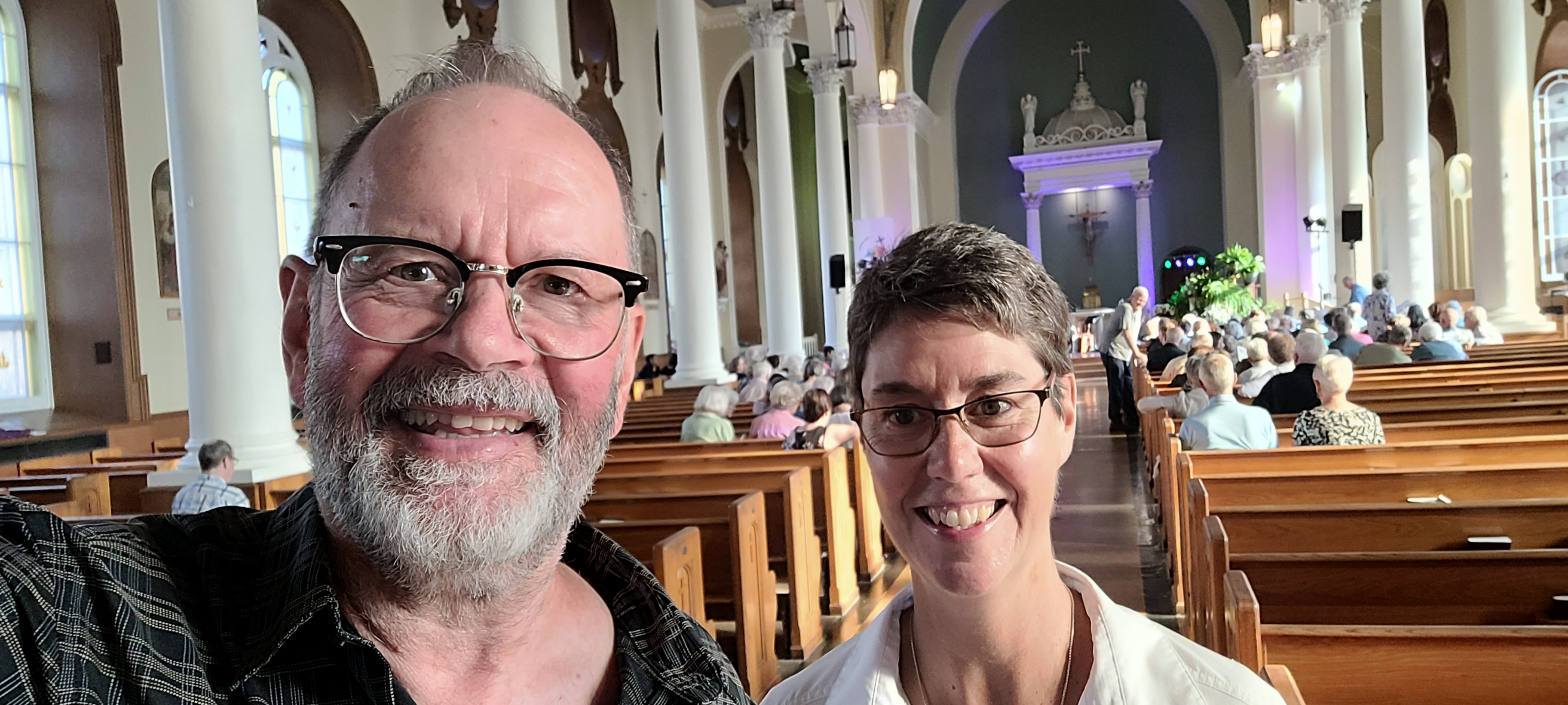 The great news: it had. No bubbles got through. This means that now no future clots can sneak through there, either. I said thank you to Dr Amy Hendricks, and told her she plays a mean piano and violin (I had been surprised to see her perform in a wonderful concert at St Ninian Cathedral). She laughed and said thank you, and that everyone needs to have a few hobbies on the side. That’s life in a small town. (Pictured are my friend and fellow pilgrim Sister RéAnne and I at the concert before it began).