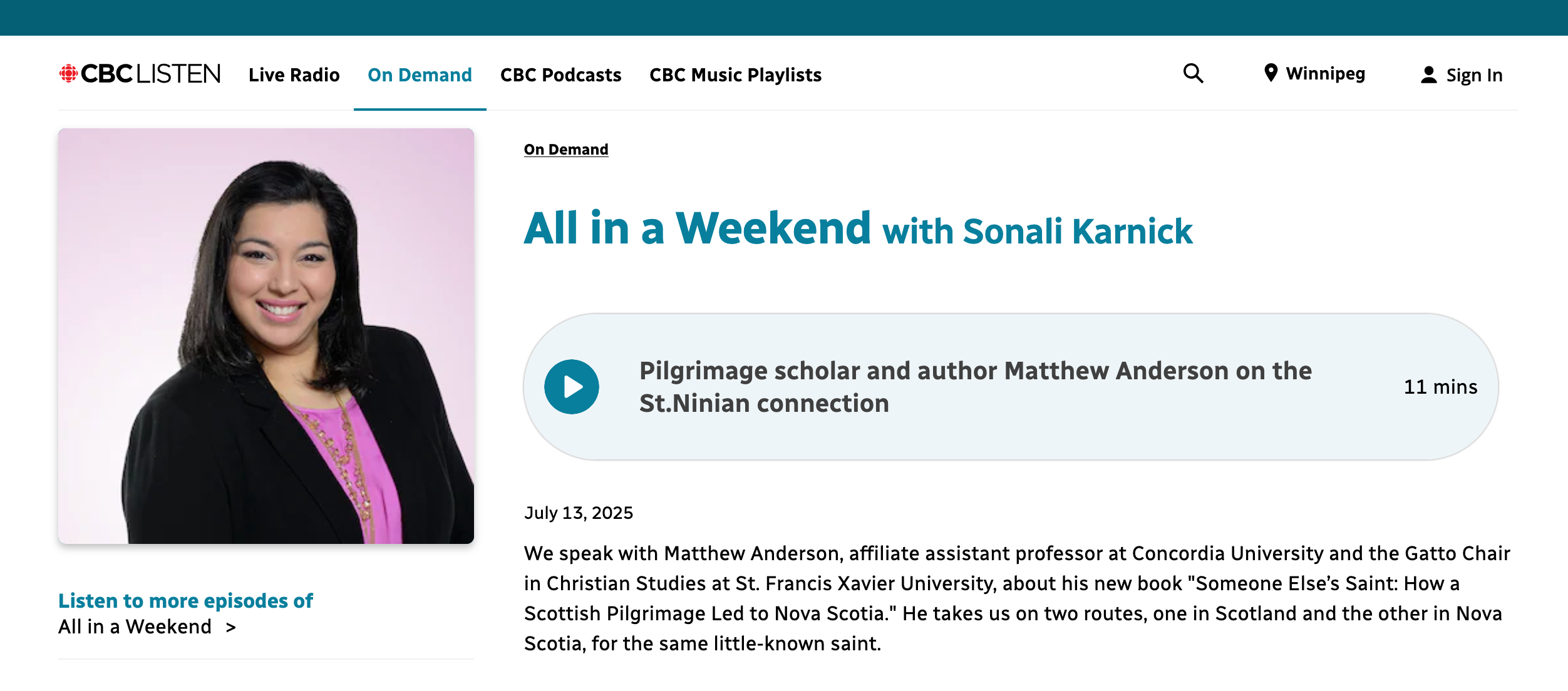 Another recent highlight for me was being interviewed by CBC Radio One Montreal’s Sonali Karnick about my new book, Someone Else’s Saint: How a Scottish Pilgrimage Led to Nova Scotia. Interview HERE. Because I’ve known lovely, warm, and good-spirited Sonali for years, and All in a Weekend’s equally warm and thoughtful producer Jill Walker and I are so comfortable with each other, the interview felt like a happy reunion. My friend and fellow author Ken Wilson said as much on social media: “You two sounded like old friends. It was like eavesdropping on a fascinating conversation at the next table.” (Speaking of fascinating, Ken’s book Walking the Bypass is coming out this fall). Did I mention you could hear Sonali’s and my conversation here?