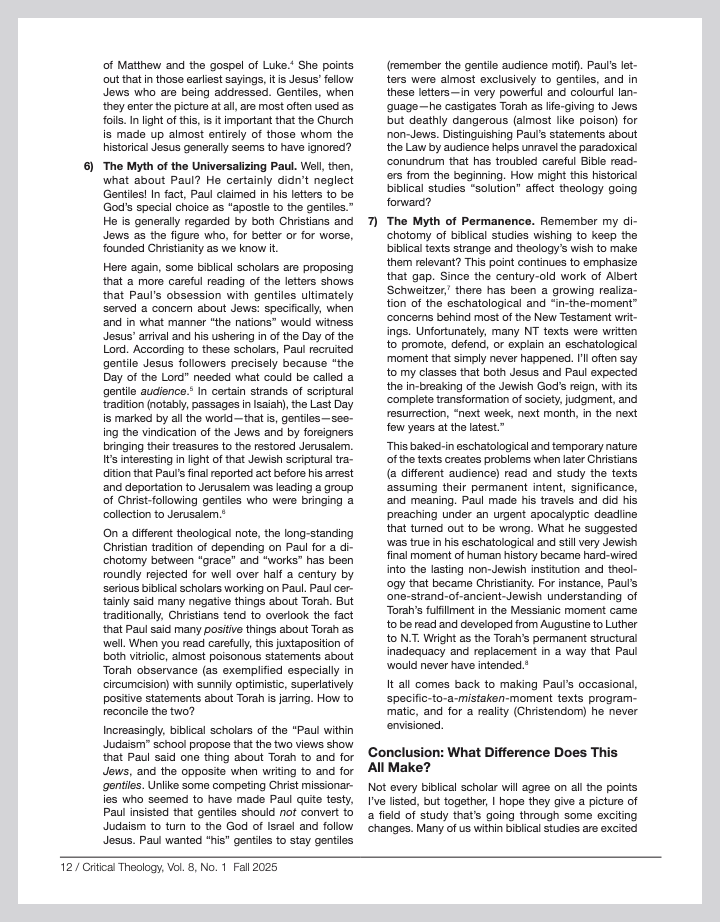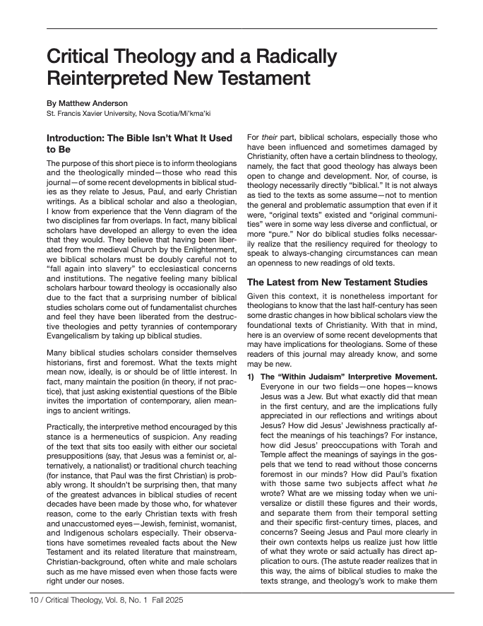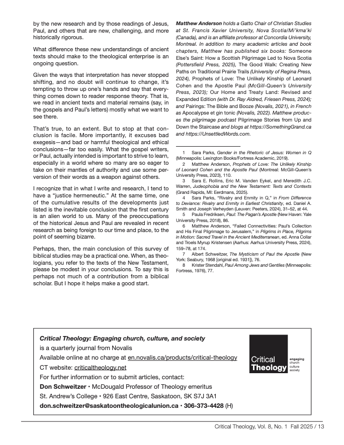Last fall my friend Dr Christine Jamieson asked if I might contribute to an upcoming issue she was editing for the Canadian-based journal Critical Theology. I wrote a short piece inviting theologians to consider what implications might arise for their work from recent research in New Testament, early Christian, and early Jewish studies. While academics produce excellent work both in Theological Studies and in Biblical Studies in Canada and around the world, they often don’t talk to each other, as I pointed out. I’m fortunate to be working and teaching as a Gatto Chair of Christian Studies at Saint Francis Xavier University, Nova Scotia. This means I can pursue biblical studies research while attuned (I hope!) to the “engaging church, culture, society” that Critical Theology’s byline promises.