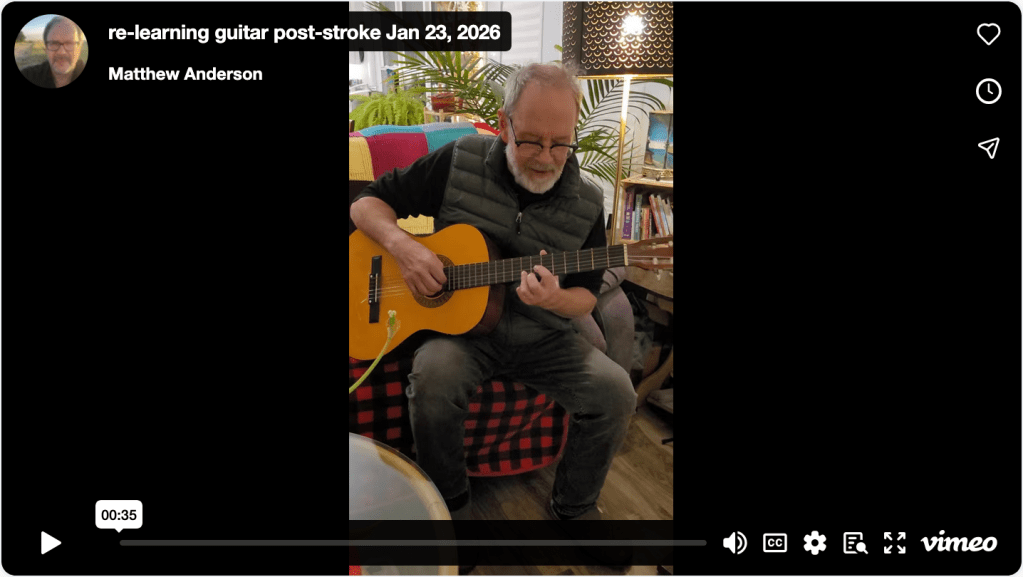What it IS, is that this last week I had Sara film my daily attempts at guitar. Every day I try to get my left hand fingers to move better by practising my playing. Here’s where I’m at post-stroke as of yesterday: https://vimeo.com/1157626018?share=copy&fl=sv&fe=ci