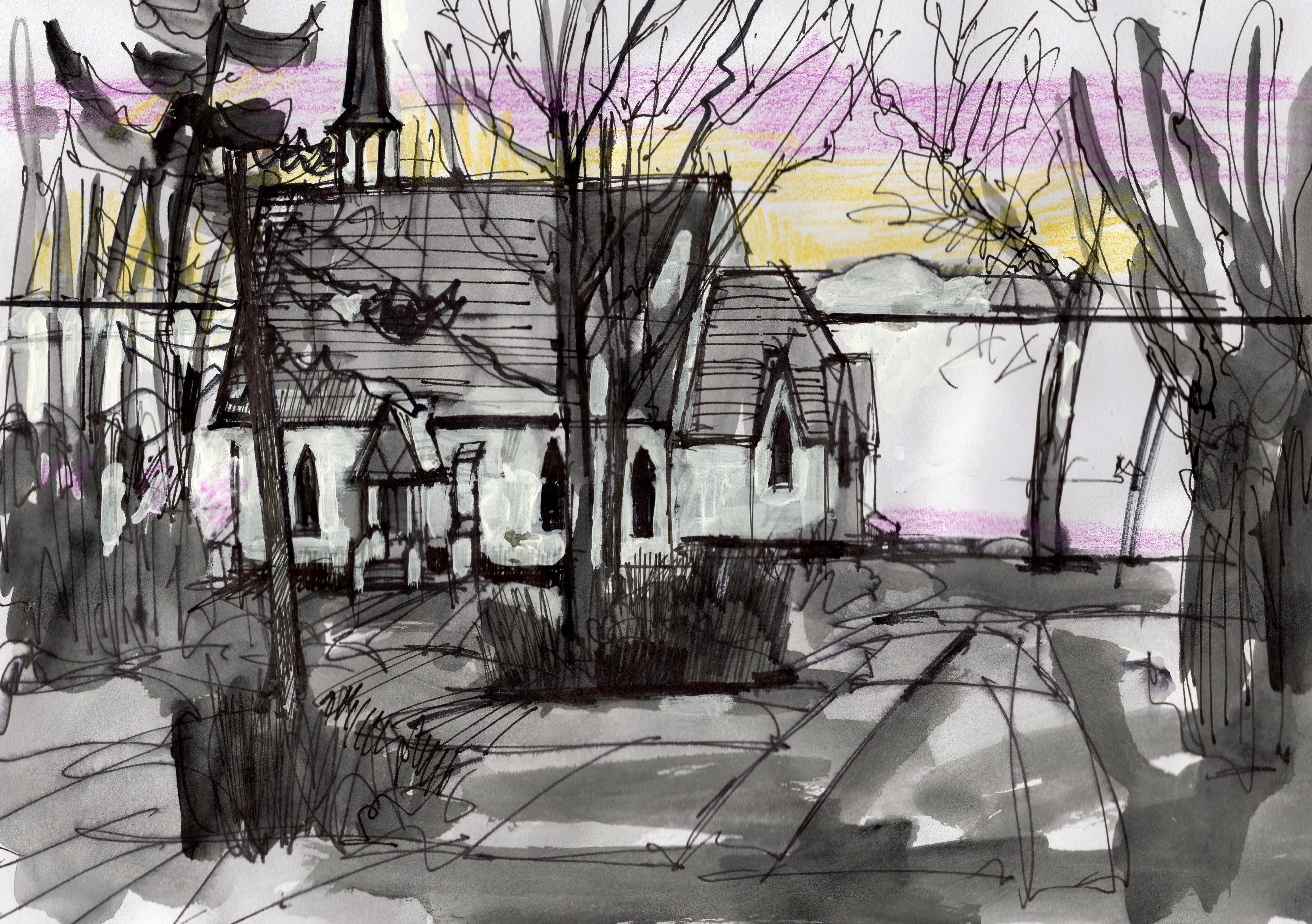 Finally, it’s not that for the first time in months I dusted off my completed novel manuscript and read through it again, and I still think it’s great! I’ve been inspired to start sending it out to publishers again. The drawing below is from my friend Robert Aubé (more at his website). The novel is set in the very real location of St James Anglican Church, Cacouna QC. I’m rejuvenated. But no. Not that either…