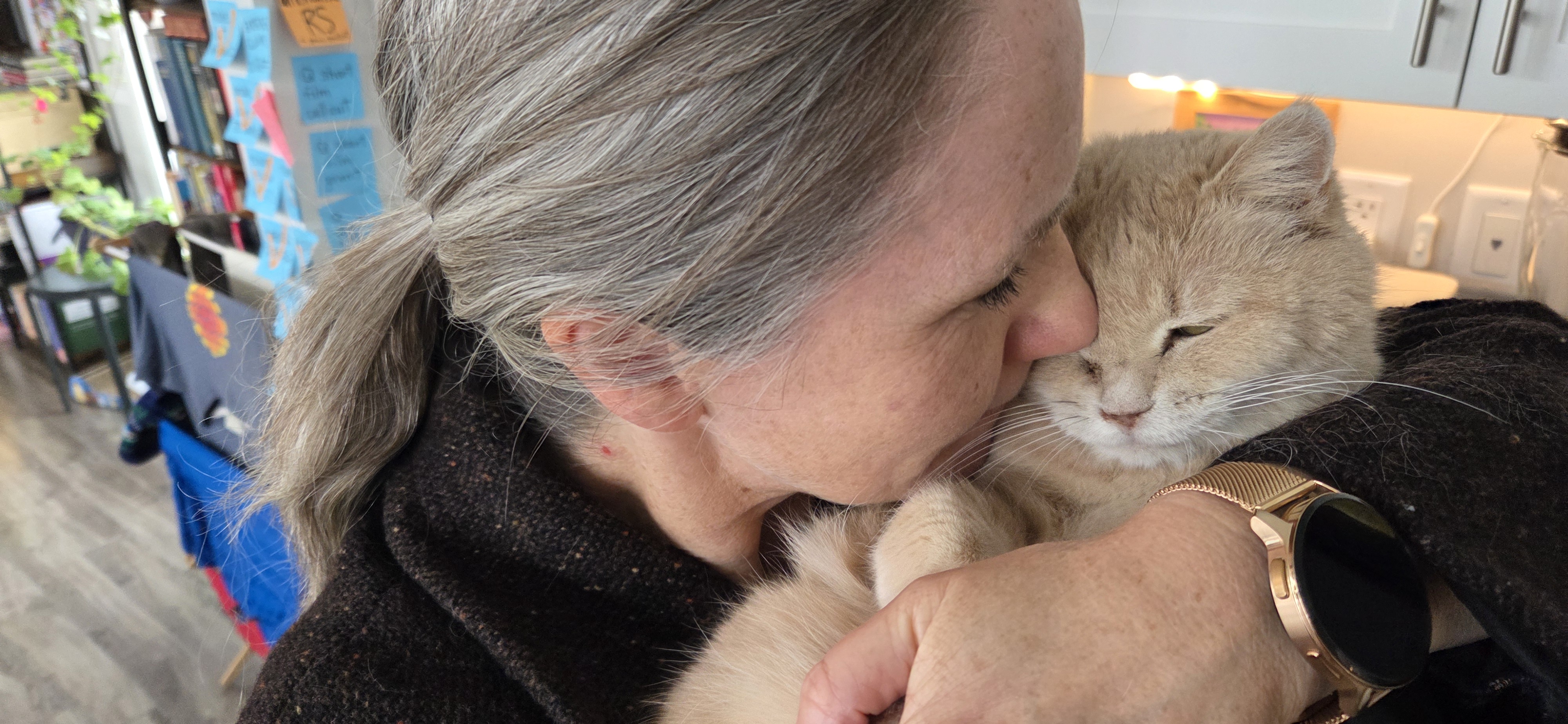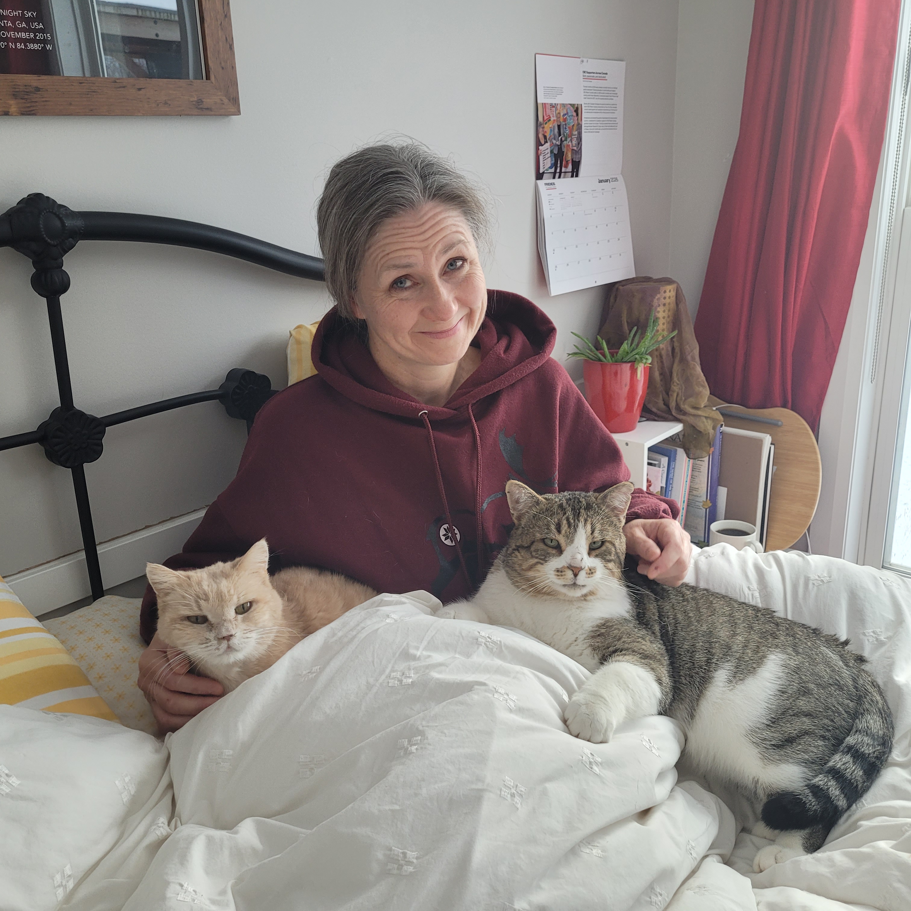 Our beloved 14 year old Sweet Pea just died. I’d had my most recent Botox shots to my left calf and arrived from the long back and forth drive to Halifax to find our elderly lady sprawled awkwardly on the bedroom floor by her food dish. When she saw me she stood to walk but kept falling sideways. I picked her up. Her head jerked in spasms every time I tried to get her to eat or drink, even her favourite tuna snack. She seemed to be experiencing terrible dizziness. Sara rushed home.We arranged an emergency vet, spent hours holding her, and only late that evening, after blood tests and consults, accepted the fact there was nothing we could do to help her. The vet believed Sweet Pea, who has been noticeably frailer recently, may have had a brain tumour (many from her semi-feral colony in Montreal had died from cancerous tumours) and that it had reached her optic nerves.