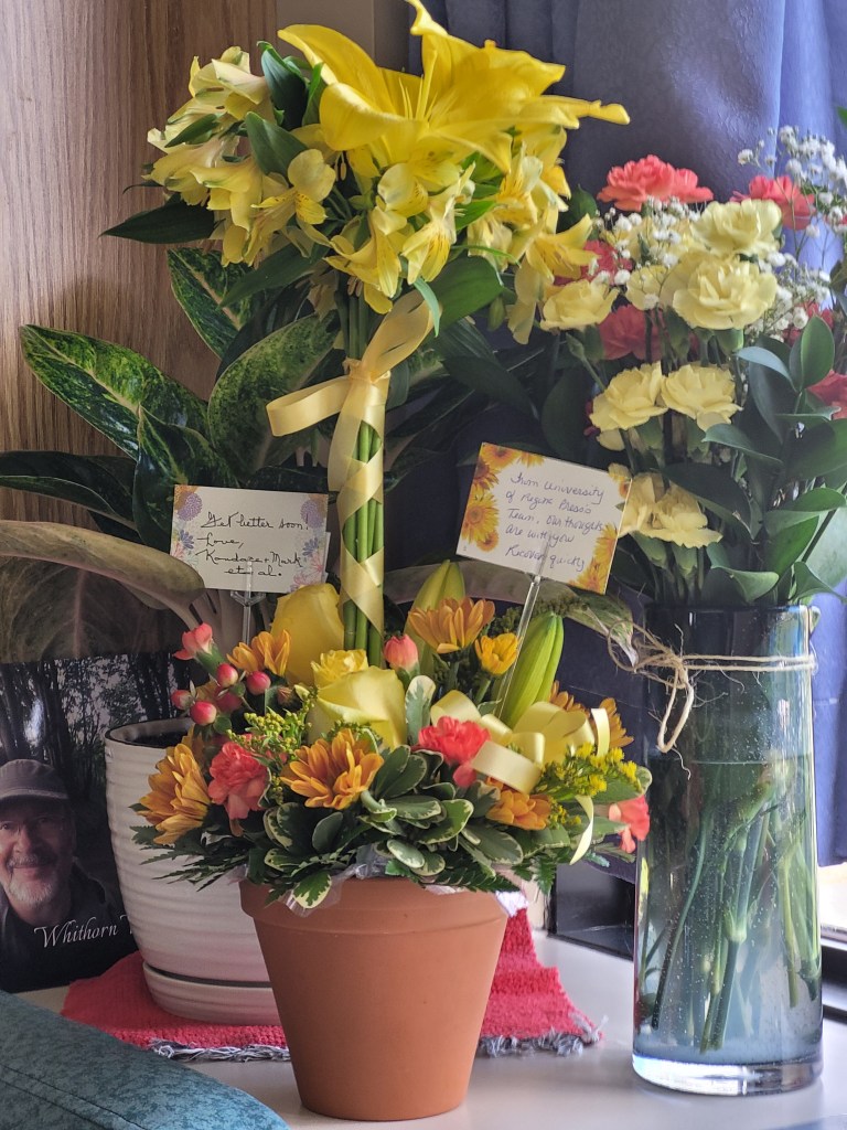 I’m thankful to the physio team – Lori, Lee, Ria, Lina, and Abby – who are so patient with me day after day. They were the ones who pushed for a room where I would get the rest my brain needs to recover. The staff know that my dogged motivation comes from being supported by so many of you. One of the orderlies looked at my shelf of cards and said “well, aren’t YOU well-loved!” That comment gave me a physical rush of warmth and comfort.